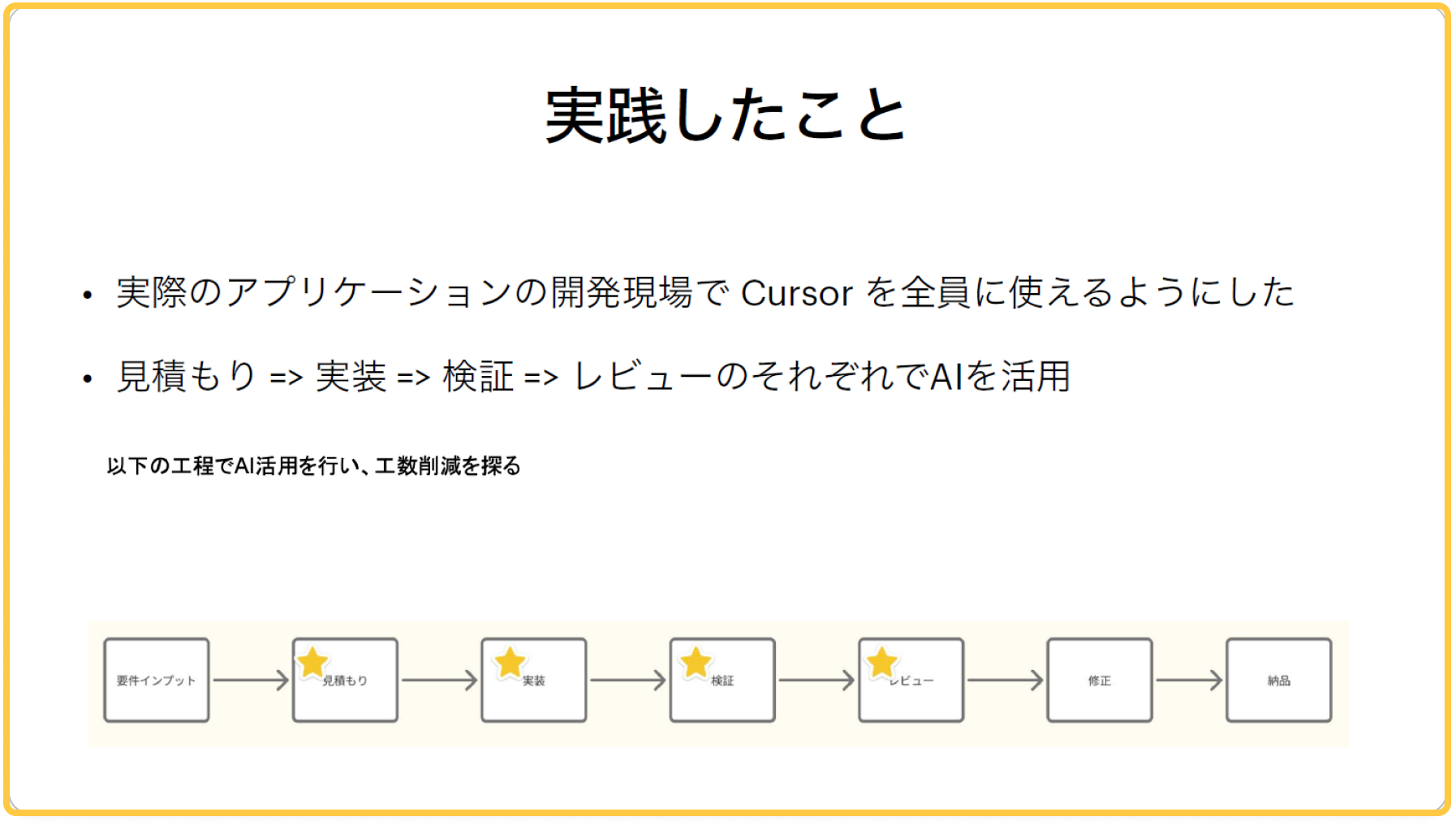 そこで、見積もり用の『Cursor』の.mdcファイル(プロジェクトのルールを定義する設定ファイル)を用意し、事前にAIエージェントと“仮打ち”を行うという取り組みを実施。より精緻な見積もりを出しやすくなりました。