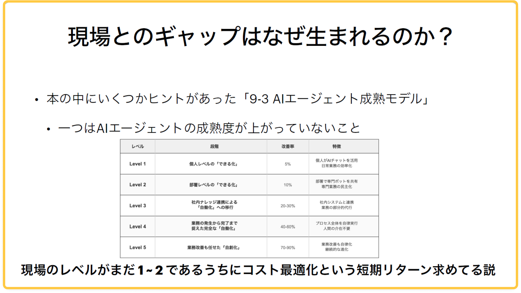しかし、現場のAI活用レベルがまだ「試行錯誤段階(上表のレベル1〜2)」にあるにもかかわらず、いきなりコスト最適化といった成果を求めてしまうと、無理が生じるおそれがあります。