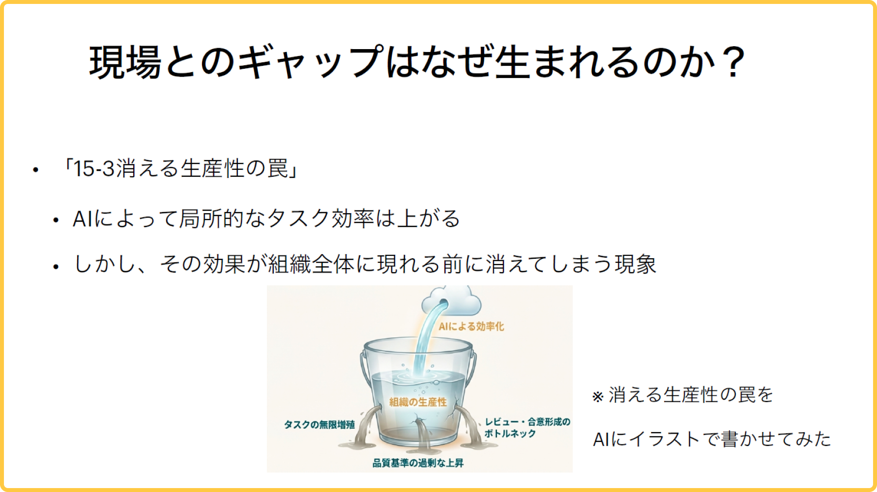 AIによって局所的なタスク効率は上がっても、その効果が組織全体に成果として現れる前に消えてしまう。なぜなら、「効率が上がって浮いた時間を何に使うか」が明確に定義されていないからです。
